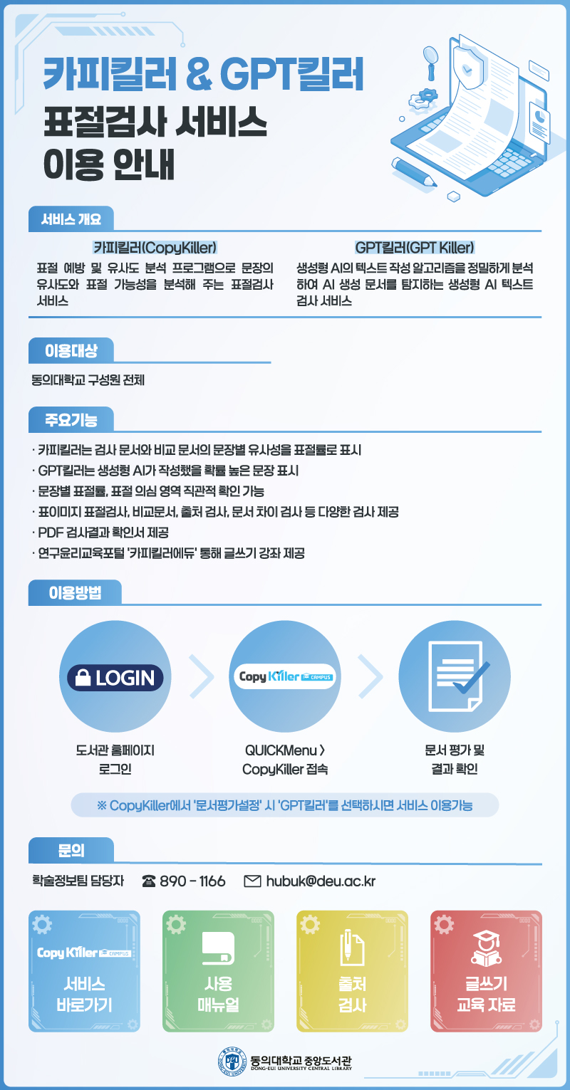 중앙도서관에서는 표절 예방 및 유사도 분석 프로그램인 카피킬러를 운영 중이며, 추가로 GPT킬러를 신규로 도입하여 운영하고자 합니다. 이에 다음과 같이 안내드리오니, 학내 구성원들의 연구와 교육에 많은 이용 바랍니다.